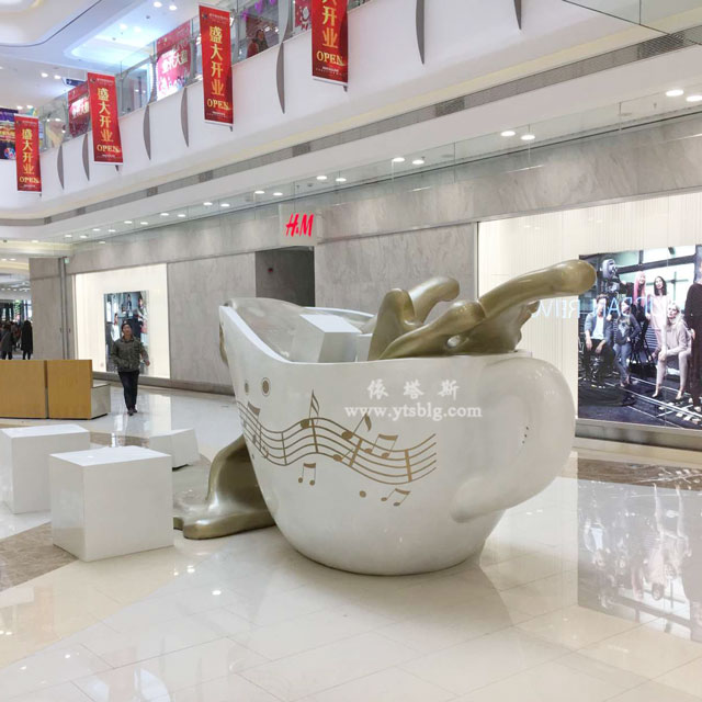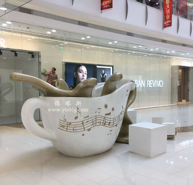 銀川新華聯(lián)購物中心為營造高品位現(xiàn)代休閑氛圍,采用音樂咖啡杯動態(tài)噴濺為美陳藝術(shù)造型,表面做彩繪亮光效果打造成高品質(zhì)玻璃鋼小品,對新華聯(lián)商場空間起到高品位的美化裝飾和陳列展示作用,彰顯了高規(guī)格、現(xiàn)代感的商業(yè)氛圍。玻璃鋼咖啡杯雕塑美陳藝術(shù)裝置美陳銀川新華聯(lián)購物中心,達(dá)到宣傳展示主題文化和推動品牌營銷的目的。