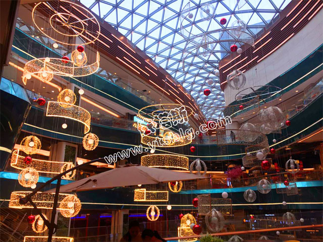 商場(chǎng)上空采用透明的玻璃制作,人們抬頭就可以看到藍(lán)天白云,陽光可以直接灑下來,整個(gè)商場(chǎng)通透明亮如同戶外,整體給人一片舒適的購物環(huán)境。依塔斯借助良好的采光在中庭懸掛暖色的燈光裝飾及彩色的球體給原本空曠的中庭增添別樣的景致。中庭美好的裝飾既能美化環(huán)境還可以使人放松愉悅。大紅色和金色的點(diǎn)綴襯托開業(yè)當(dāng)天熱鬧喜慶的氛圍,也預(yù)示著新的一年紅紅火火的景象。