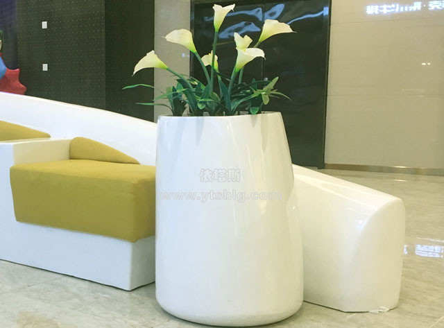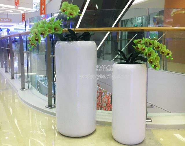 ? ? 經(jīng)典的圓柱形花盆一直是商場的主角,這組玻璃鋼的花盆尺寸分別為直徑400,高900,直徑300,高700MM,一高一低,大小不一。平底設(shè)計,擺放平穩(wěn)不易倒。圓滑的外形擺放在電梯口位置不影響人群通行,具有很強的造景功能。