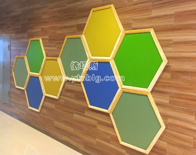 ? ? 這組正多邊形的背景墻長7米、高3米,分別由9個直徑為900mm的正多邊形彩色框進(jìn)行組合裝飾。其中外框采用12mm木質(zhì)夾板邊框加軟包,表面采用彩色噴繪貼紙裝飾。淺色的木框與深色的背景形成明顯的層次感,深藍(lán)色、亮黃色和淺綠色形成強烈的色彩對比,亮麗的顏色充滿活力??瞻椎牟噬颍唵蚊髁?,缺極具空間幾何感,整體效果非常時尚。