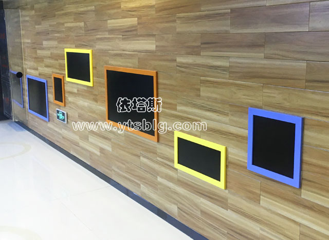 ? ? 兒童趣味墻由矩形框進(jìn)行裝飾,藍(lán)黃相間的彩色框邊寬40mm,規(guī)格有1000*600mm、800*400mm、600*300mm、400*400mm等隨機組合而成,表面采用黑色貼紙,可供兒童們在上面進(jìn)行作畫。簡單的裝飾讓墻面不再孤單,無形中還可以與顧客進(jìn)行互動,非常人性化的設(shè)計讓空間更富創(chuàng)意和趣味性。這樣的裝飾不僅工序簡單,環(huán)保、后期的可創(chuàng)造性強,是非常不錯的墻面裝飾品。