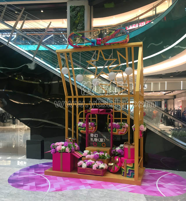 ? ? 步步高商場這次母親節(jié)也不例外,由深圳依塔斯為其設(shè)計安裝的DP點裝飾成為商場母親節(jié)當天最亮麗的風景。整體造型呈房屋狀,金色的主體框架搭配時尚亮麗的漸變紫色,奢華而又極具女性特色的色彩搭配讓人滿心歡喜。造型頂端彩色條紋的蝴蝶結(jié)裝飾更是充滿了少女情懷,這也是每一位母親內(nèi)心的夢想。