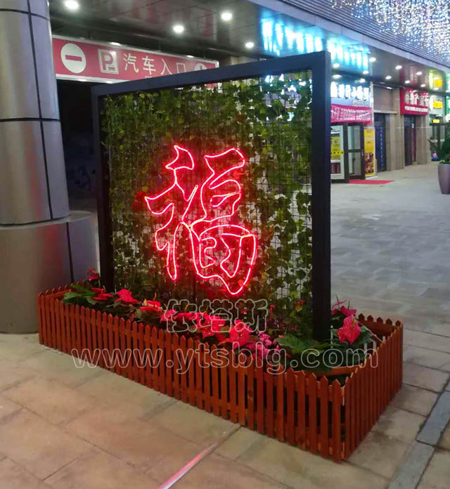 ? ? 鐵藝框架制作完成后,在鐵網(wǎng)中間布置仿真的爬山虎綠植,由下向上進行延伸,使得鏤空的鐵網(wǎng)不會那么單調(diào),也可以當(dāng)作福字的背景。底座四周則采用仿真紅掌進行裝飾,紅掌的美好寓意與福字遙相呼應(yīng)。傳統(tǒng)的福字與黑色鐵框的完美結(jié)合,滿滿的時尚與創(chuàng)意,插上電源紅色通透的福字照亮背景的爬山虎,紅綠相間。為了確保造型的穩(wěn)定性,底座外圍用200mm高的木柵欄進行圍繞,這樣花盆不容易錯亂,也可以防止兒童觸摸福字或攀爬鐵網(wǎng)等發(fā)生危險。鏤空的鐵網(wǎng)設(shè)計的使得視線不被阻擋,整體造型簡約頗有層次感,喜慶吉祥的福字造型框惹來不少人駐足拍照。