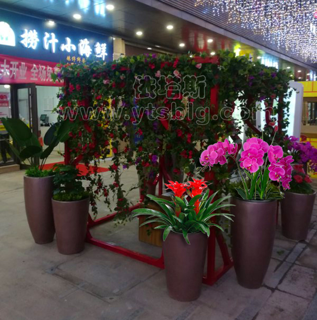 ? ? 福字框整個(gè)造型尺寸為2000mm*2000mm*2000mm,造型上空采用仿真藤條進(jìn)行裝點(diǎn),花藤向四周蔓延、下垂。里面用來擺放休閑椅,四周擺放玻璃鋼花盆和綠植,除了為人們提供夏季陰涼的休息去處同時(shí)也是人們拍照留念的打卡圣地。五面福字同時(shí)也寓意為五福臨門,向人們傳達(dá)著美好的祝福。依塔斯采用優(yōu)良的材質(zhì)和精湛的工藝為該商場打造的安全、喜慶、創(chuàng)意的造型贏得該商場負(fù)責(zé)人的一致好評,也為該商業(yè)街打造一處亮麗的風(fēng)景。