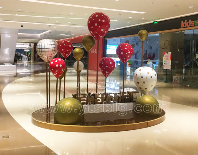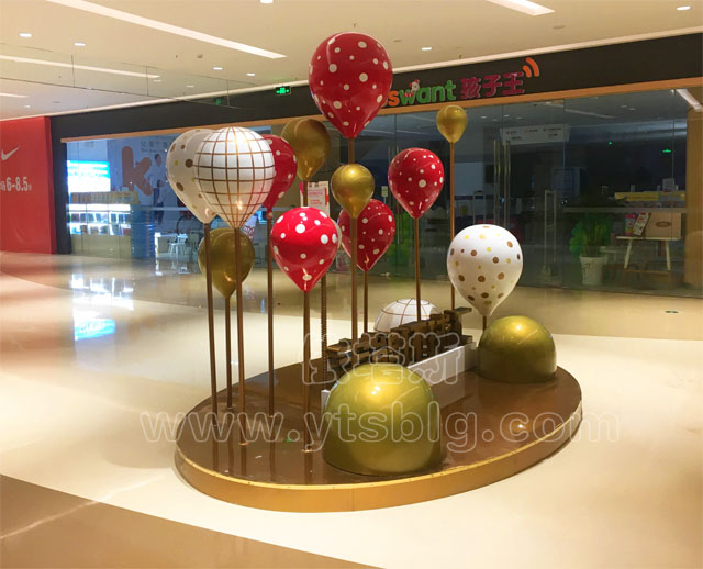 ? ? 下面請(qǐng)跟隨依塔斯一起來(lái)欣賞近期寶能環(huán)球匯充滿質(zhì)感的開(kāi)業(yè)美陳裝飾,大門(mén)口DP點(diǎn)裝飾,充滿西方特色的顏色和造型除了開(kāi)業(yè)喜慶同時(shí)體現(xiàn)出該商場(chǎng)的高級(jí)感。這組造型主要是由一些大小不一的氣球造型通過(guò)鋼管固定在底板上,整體造型并不復(fù)雜,但是在材質(zhì)選擇 上設(shè)計(jì)師卻是做足了功夫,其中氣球造型的材質(zhì)各不相同,直徑比較大的采用玻璃鋼材質(zhì)進(jìn)行制作,外表再進(jìn)行彩繪,效果圖非常逼真。其余的又分為兩種工藝分別進(jìn)行制作,實(shí)體的采用亞克力工藝并可以吸塑發(fā)光。鏤空的部分為不銹鋼網(wǎng)噴漆內(nèi)加亞克力氣球造型。整體顏色以紅色、金色、白色為主,底下做了寶能環(huán)球匯等金色LOGO,使得該商場(chǎng)達(dá)到了有效的推廣。