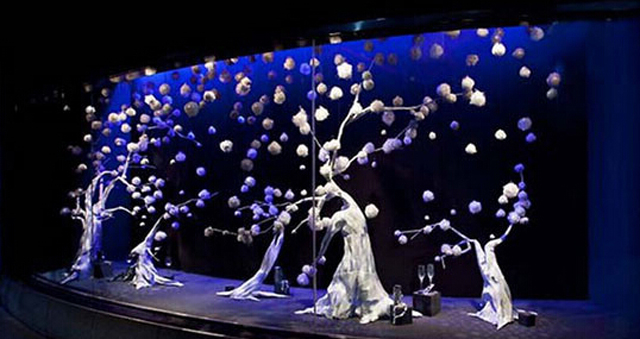 ? ? ? ?滿樹的花朵盛開在藍色燈光下,整個櫥窗展示給人們清冷脫俗的感覺。