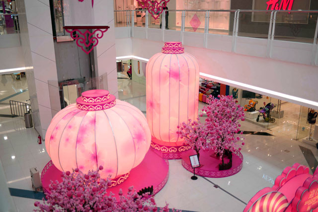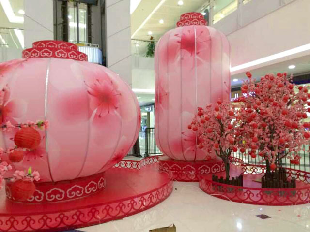 ? ? ? ? 商場內(nèi)一整套DP點(diǎn)陳列,一高一低兩個燈籠,互為主次,錯落有致,大小得當(dāng)。燈籠的燈頭深紅色底色上的中式祥瑞圖案,舒心奪目。燈籠上精心制作的手繪桃花,濃淡皆宜,大小得當(dāng),映襯桃花爛漫春節(jié)到來!燈籠外的地護(hù)圍欄也沿用祥瑞中式圖案上下貫通,設(shè)計(jì)一氣呵成。而旁邊的桃花,桃花樹上的小燈寵及旁邊的桃花塢石刻,在這樣的場景襯托之下,把觀眾對節(jié)日的情感推至高潮,也把浪漫溫馨紅火的春節(jié)季,表現(xiàn)得淋漓盡致!
