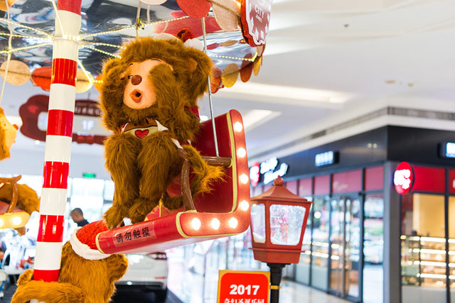? ? ? ? 旋轉(zhuǎn)飛椅——身著圣誕服飾的呆萌猴子、害羞遮眼的猴子、齜牙大笑的猴子一起玩轉(zhuǎn)旋轉(zhuǎn)飛椅,寫實的將我們在游樂園里坐旋轉(zhuǎn)飛椅子時的各種神態(tài)給表現(xiàn)出來了。制作上泡沫、玻璃鋼塑形,外置仿真毛發(fā),讓猴子的造型更有質(zhì)感。相信看了這個場景的顧客,都可以感受到我們想傳遞的溫暖快樂。