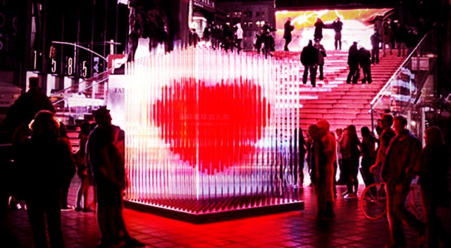? ? 紐約時代廣場中心安上一顆巨大的能夠測量“愛的脈搏”的大紅心,去觸摸它就會跳動,而牽手或者親吻則會令這件交互式的作品跳動地更快,更為明亮。該作品由400根透明的LED 亞克力管構(gòu)成一顆立體的懸浮的心臟,心臟中心的霓虹燈透過離心管發(fā)生折射。去觸碰這顆心臟附近的傳感器的人越多,心臟跳動的頻率就越快。