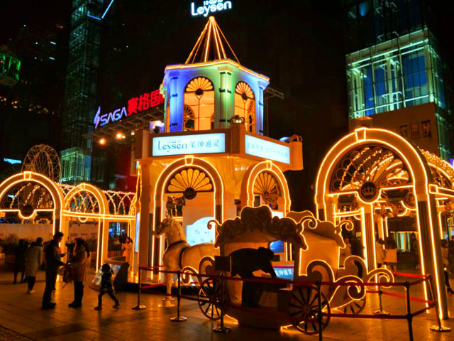 ? ? 賽格國際購物中心的圣誕美陳屬于一個集大成者,廣場共有六個圣誕美陳展示。賽格廣場作為一個舞臺,讓六家品牌充分展示各自的風(fēng)格和主題,讓費者在這個區(qū)域里感受到更多的元素。從地鐵口出來,通靈珠寶的夢幻長廊、童話城堡和馬車立馬吸引了眾人的眼球。看慣了圣誕樹,這種具有新意的圣誕設(shè)計也算是別具匠心。