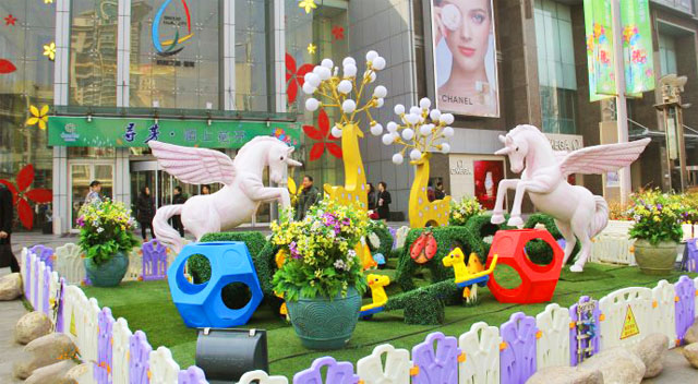 ? ? 由春天的花制成的鐵藝樹,滿滿都是春天的色彩;生動(dòng)的白馬和可愛的小動(dòng)物們聚集在樹下嬉鬧。商場(chǎng)的各個(gè)角落也都有春色點(diǎn)綴,讓顧客感受身邊的自然氣息。商場(chǎng)門前的綠色主題園藝布展,更富視覺沖擊力,將動(dòng)物造型與創(chuàng)意花藝相結(jié)合,一清早就給人們帶來了足夠的驚喜。許多匆匆的路人都不由驚呼雀躍,競相駐足拍照,以此開啟一天明媚的心情。