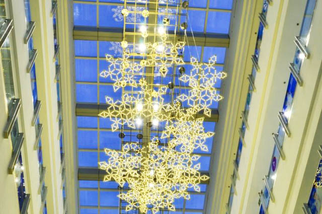 設(shè)計(jì)師以“雪花”為元素,用抗拉力二次加厚波纖板開模沖壓成形,電腦3D打印紋路燈珠(5050,0.5w/顆):360顆電源;雙面燈珠,中間主電線用電鍍圓形鋼管套住,四周再加以纖細(xì)鋼絲斜拉向中間線聚結(jié)穿過(guò)中間鋼管。安裝后整片以水平為準(zhǔn),不下垂變形。通過(guò)板來(lái)導(dǎo)電,珠是穿透整片板的制作方式打造繁花絢爛,繁星點(diǎn)點(diǎn)。營(yíng)造炎熱夏季漫天飄雪清涼的氛圍環(huán)境,走進(jìn)商場(chǎng)更舒適,更優(yōu)美,以此來(lái)達(dá)到吸引更多人流和增加購(gòu)物力度的目的。