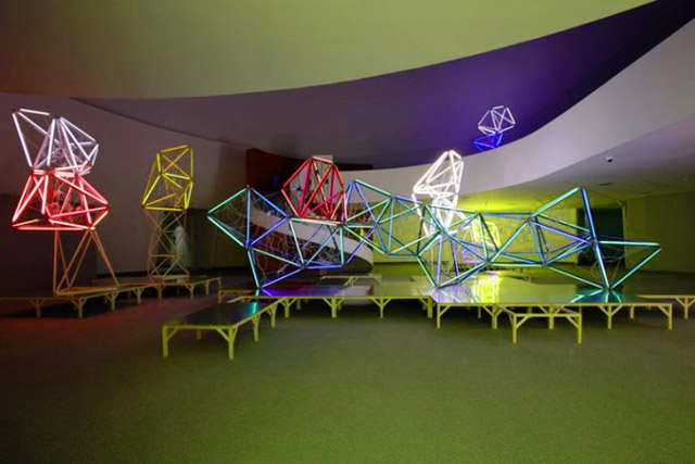 ? ? “undreamed territories(意想不到的領(lǐng)地)”是由許多復(fù)雜的大型多邊形結(jié)構(gòu)構(gòu)成的藝術(shù)裝置作品,因為運用了熒光管,它的色彩和和顏色強度不斷地發(fā)生著變化。該系列作品是由carlos coronas制作的,被放在西班牙阿維萊斯尼邁爾中心進(jìn)行展覽,它的主構(gòu)架其實是用木頭做成的,相互之間通過電子熒光相互呼應(yīng)著。空間里燈光的逐漸上升和下降模仿了人類呼吸的感覺,讓每個單獨的裝置看上去就像是活著的器官一樣。