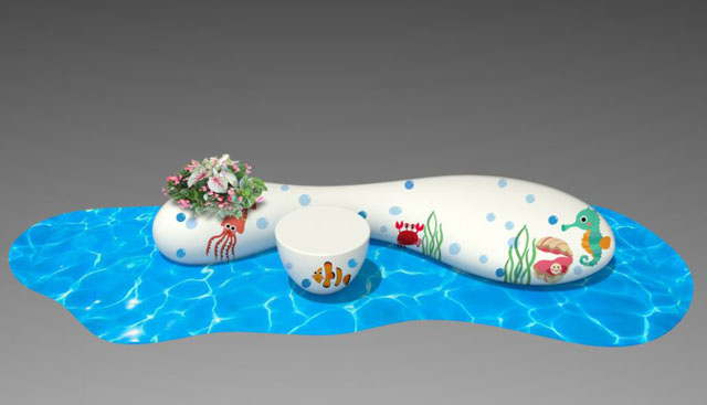 休息區(qū)效果——萌萌的印花休閑椅如泡泡一樣漂浮在海面上,想象一下漂浮在海面上喝茶的情景,充滿快樂、愜意、舒適。想要一起探索“海之奇緣”?快將你家的“海洋萌寵”領回商場!