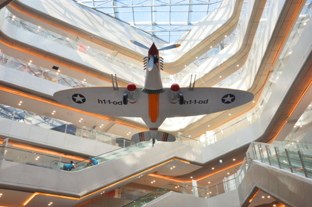 ? ? 在一層購(gòu)物大廳,一架充滿濃郁二戰(zhàn)色彩的鯊魚(yú)頭戰(zhàn)機(jī)帶領(lǐng)消費(fèi)者穿越時(shí)空,回到那個(gè)戰(zhàn)爭(zhēng)但純真的年代。還有帶有工業(yè)氣息的炫酷雙翼戰(zhàn)機(jī),感受人類的偉大智慧。