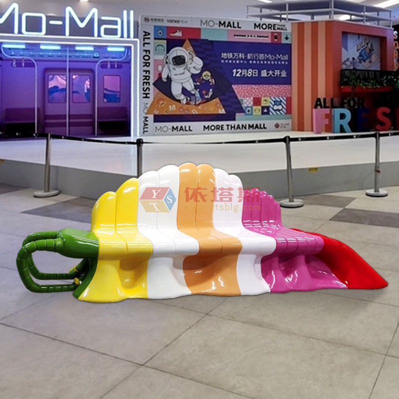 ? ? ? ? ? 長椅采用蜜蜂造型設(shè)計(jì),頭部為鮮艷的綠色,象征蜜蜂可愛的面部特征。椅身則延續(xù)蜂巢的六邊形概念,采用六個(gè)明快色彩分段:黃色、白色、卡其色、白色、玫紅色,最后以醒目的紅色收尾。每種顏色清晰地界定出一個(gè)獨(dú)立座位,形成六人座的合理布局,既避免擁擠感,又營造出歡快的視覺效果。