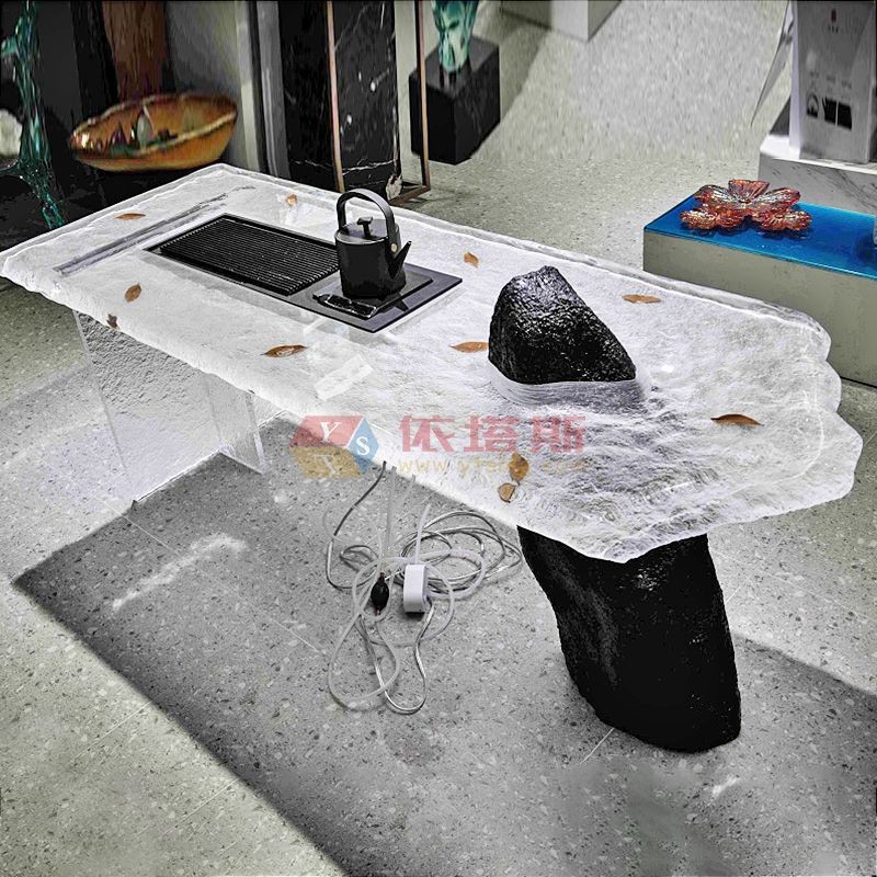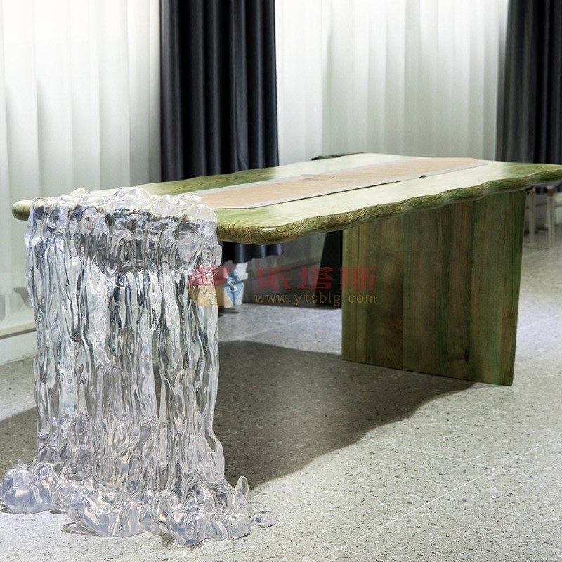 ? ? ? ? ?觸手所及,表面是經(jīng)過精細(xì)打磨的溫潤平滑,全然沒有真冰的刺骨寒意,卻保留了冰的視覺清涼。這種觸感與觀感之間的微妙矛盾,正是其設(shè)計(jì)的精妙之處。桌面之下,常常嵌入天然材質(zhì)的基座,或是粗獷沉穩(wěn)的原木,或是冷峻硬朗的黑鐵。木材的溫厚與樹脂的冰透,鋼鐵的堅(jiān)毅與“冰川”的脆弱美感,在此刻達(dá)成了和諧的統(tǒng)一,仿佛冰川悄然生長于凍土與巖層之上,自然之力與現(xiàn)代工藝渾然天成。